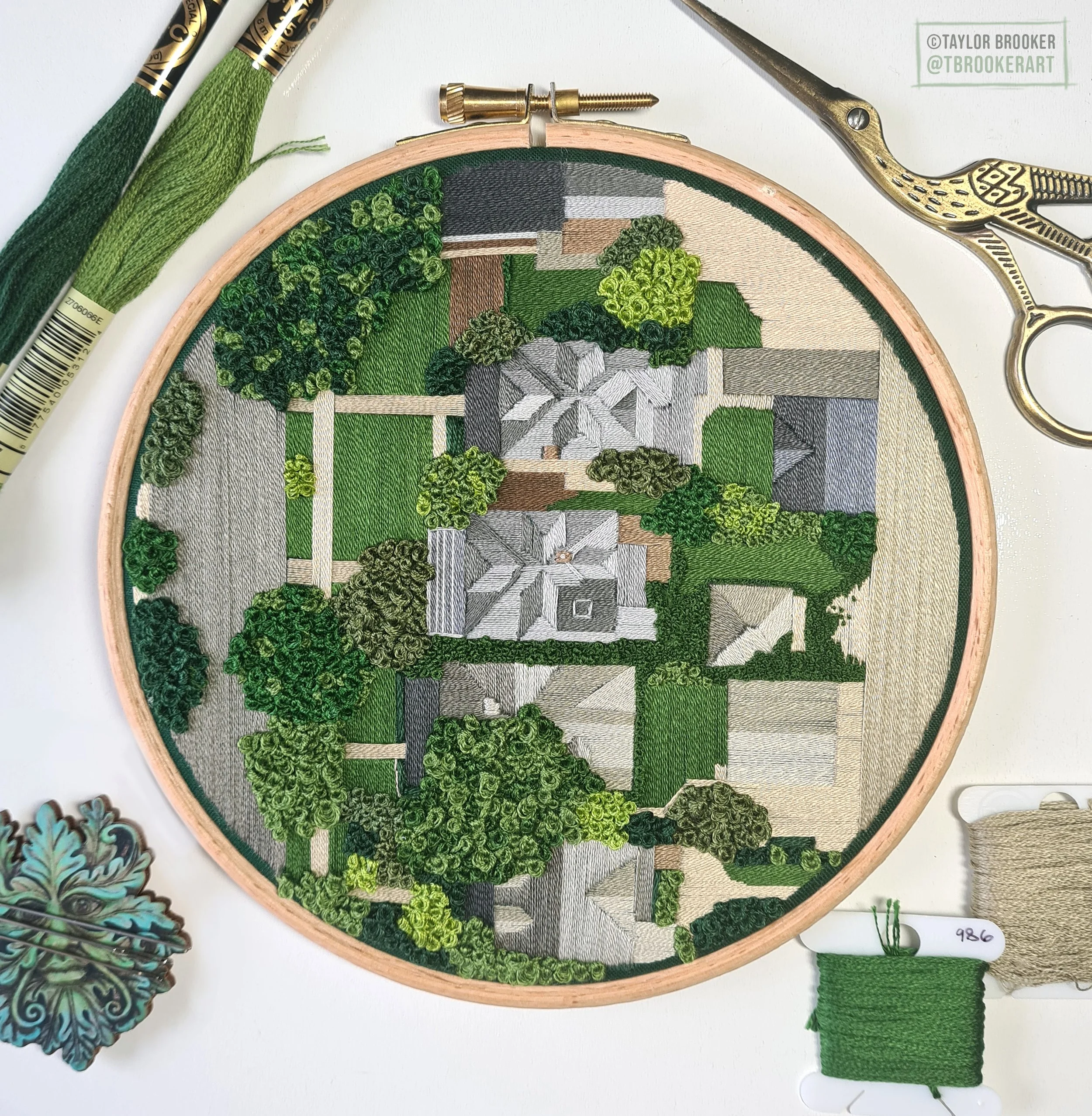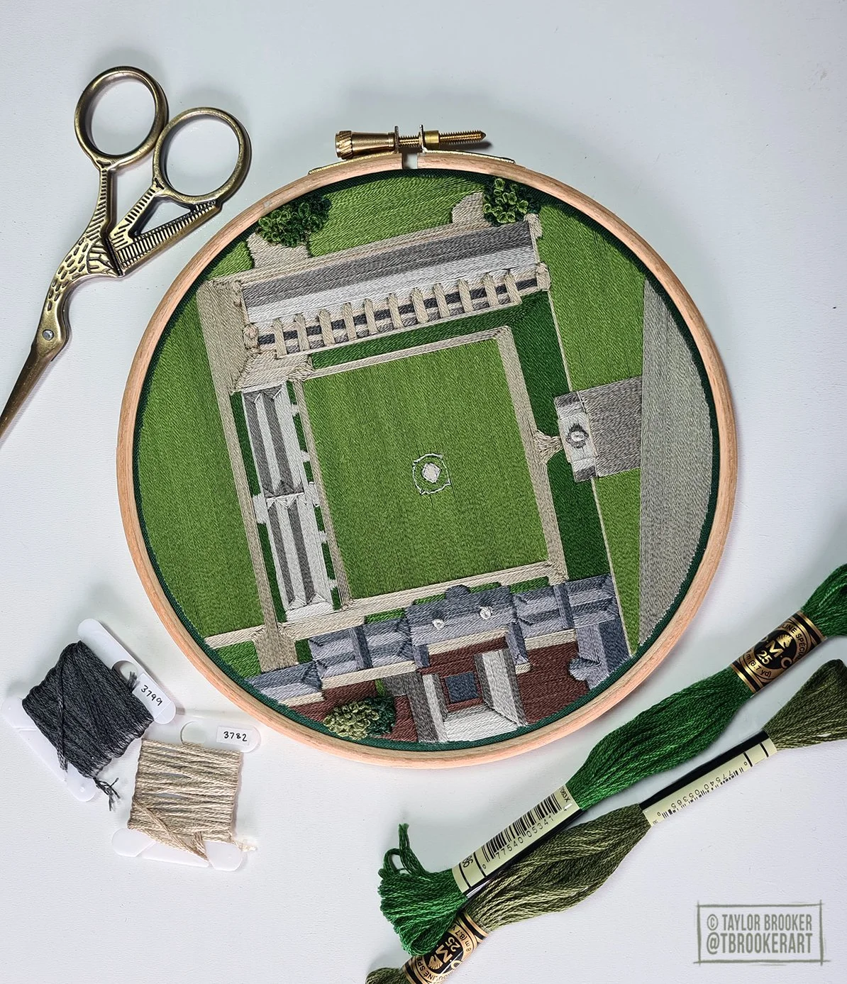 An embroidered wedding venue commission from last year ๐ŸŒฑ๐Ÿ’’ Commission info is on my website if you'd like something similar! www.tbrookerart.co.uk