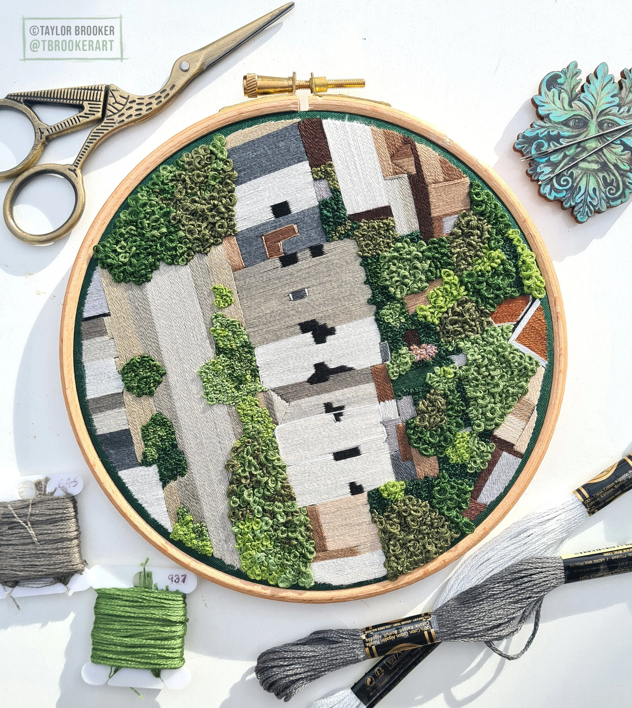 #aeriallandscapeembroidery #aerialembroidery #landscapeembroidery #embroidery #handmadewithlove #loveembroiderymag #dmcthreads #dmcembroidery #satinstitch #frenchknots #cottagecore #modernembroidery #countryside #cotswolds #